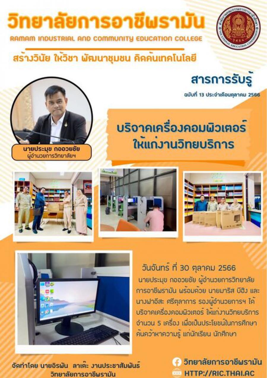 วันจันทร์ ที่ 30 ตุลาคม 2566 นายประมุข กออวยชัย ผู้อำนวยการวิทยาลัยการอาชีพรามัน พร้อมด้วย นายมาริส บีฮิง และนางฟาอีสะ ศรีตุลาการ รองผู้อำนวยการฯ ได้บริจาคเครื่องคอมพิวเตอร์ ให้แก่งานวิทยบริการ จำนวน 5 เครื่อง เพื่อเป็นประโยชน์ในการศึกษาค้นคว้าหาความรู้ แก่นักเรียน นักศึกษา S:0