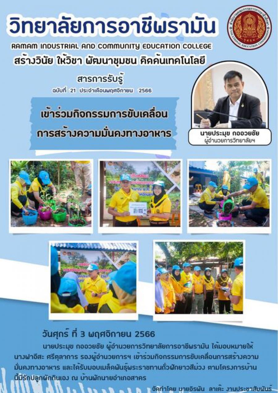 วันศุกร์ ที่ 3 พฤศจิกายน 2566 นายประมุข กออวยชัย ผู้อำนวยการวิทยาลัยการอาชีพรามัน ได้มอบหมายให้นางฟาอีสะ ศรีตุลาการ รองผู้อำนวยการฯ เข้าร่วมกิจกรรมการขับเคลื่อนการสร้างความมั่นคงทางอาหาร และได้รับมอบเมล็ดพันธุ์พระราชทานถั่วฝักยาวสีม่วง ตามโครงการบ้านนี้มีรักปลูกผักกินเอง ณ บ้านพักนายอำเภอศรีสาคร S:0