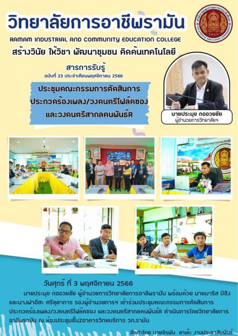 วันศุกร์ ที่ 3 พฤศจิกายน 2566 นายประมุข กออวยชัย ผู้อำนวยการวิทยาลัยการอาชีพรามัน พร้อมด้วย นายมาริส บีฮิง และนางฟาอีสะ ศรีตุลาการ รองผู้อำนวยการฯ เข้าร่วมประชุมคณะกรรมการตัดสินการประกวดร้องเพลง/วงดนตรีโฟล์คซอง และวงดนตรีสากลคนพันธ์R ดำเนินการโดยวิทยาลัยการอาชีพรามัน ณห้องประชุมชั้น2อาคารวิทยบริการ วก.รามัน S:0