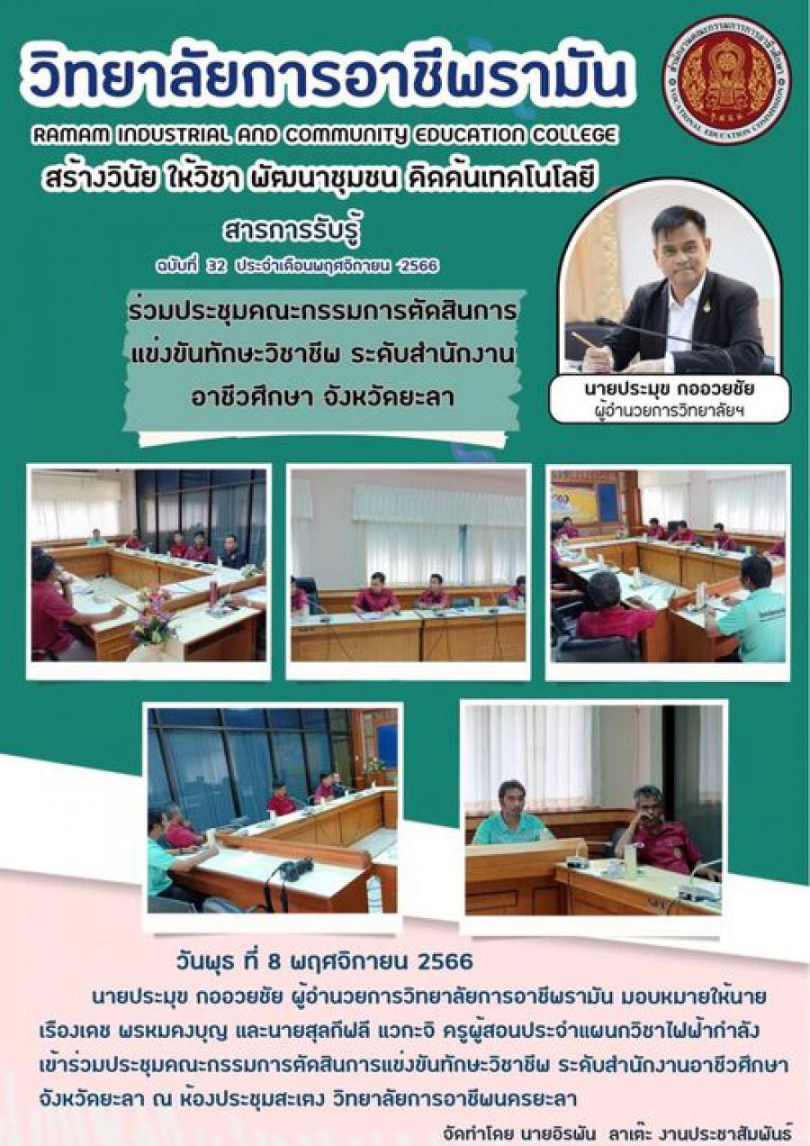 วันพุธ ที่ 8 พฤศจิกายน 2566 เวลา13.30 น. นายประมุข กออวยชัย ผู้อำนวยการวิทยาลัยการอาชีพรามัน มอบหมายให้นายเรืองเดช พรหมคงบุญ และนายสุลกีฟลี แวกะจิ ครูผู้สอนประจำแผนกวิชาไฟฟ้ากำลัง เข้าร่วมประชุมคณะกรรมการตัดสินการแข่งขันทักษะวิชาชีพ ระดับสำนักงานอาชีวศึกษา จังหวัดยะลา ณ ห้องประชุมสะเตง วิทยาลัยการอาชีพนครยะลา S:0