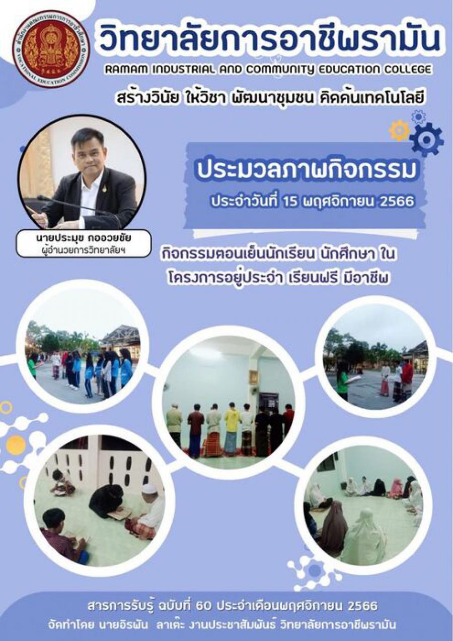 กิจกรรมตอนเย็นนักเรียน นักศึกษา ในโครงการอยู่ประจำ เรียนฟรี มีอาชีพ วิทยาลัยการอาชีพรามัน ประจำวันพุธ ที่ 15 พฤศจิกายน 2566 S:0