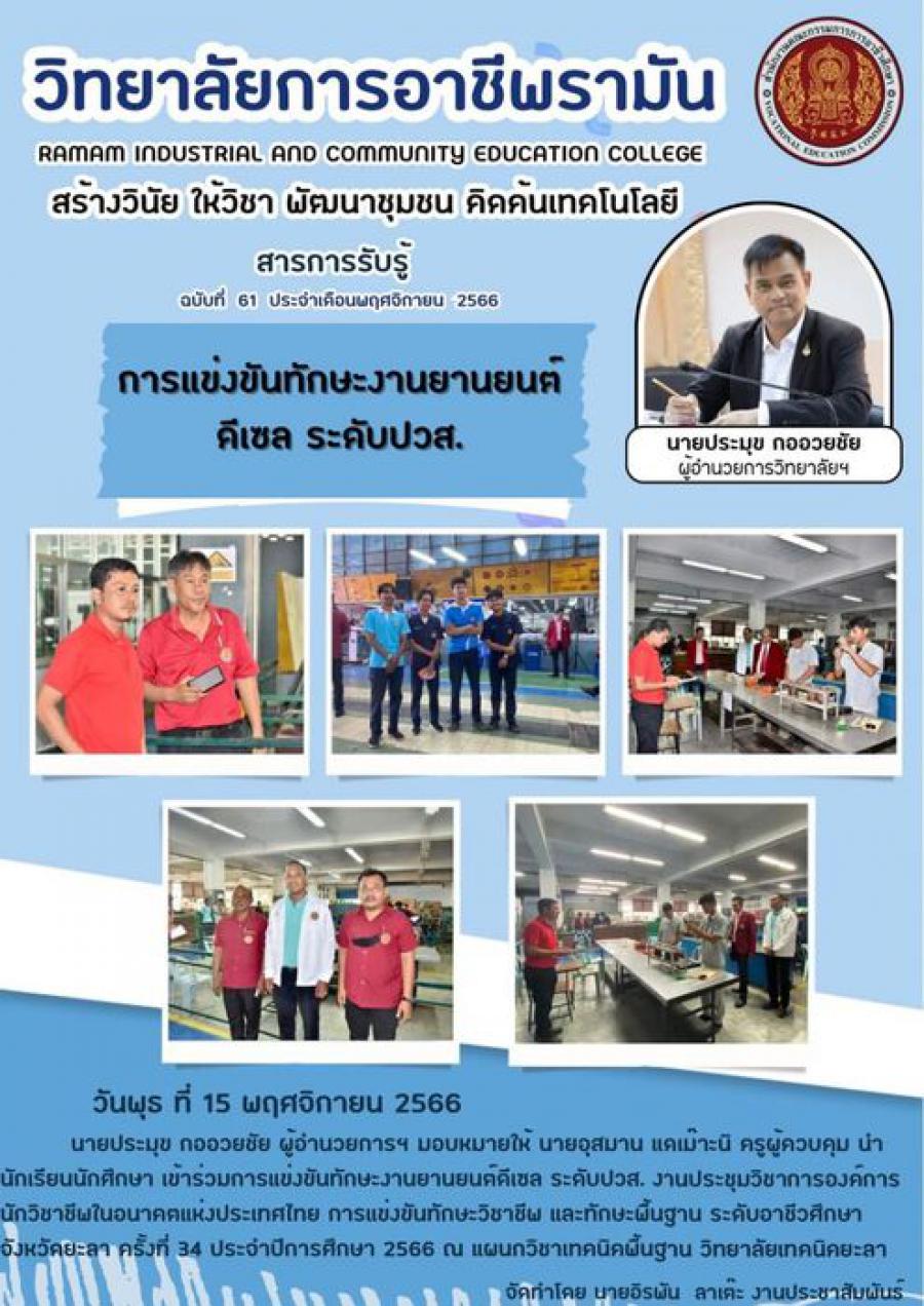 วันพุธ ที่15 พฤศจิกายน 2566 นายประมุข กออวยชัย ผู้อำนวยการวิทยาลัยการอาชีพรามัน มอบหมายให้ นายอุสมาน แดเม๊าะนิ ครูผู้ควบคุม นำนักเรียนนักศึกษา เข้าร่วมการแข่งขันทักษะงานยานยนต์ดีเซล ระดับปวส. งานประชุมวิชาการองค์การนักวิชาชีพในอนาคตแห่งประเทศไทย การแข่งขันทักษะวิชาชีพ และทักษะพื้นฐาน ระดับอาชีวศึกษาจังหวัดยะลา ครั้งที่ 34 ประจำปีการศึกษา 2566 ณ แผนกวิชาเทคนิคพื้นฐาน วิทยาลัยเทคนิคยะลา S:0