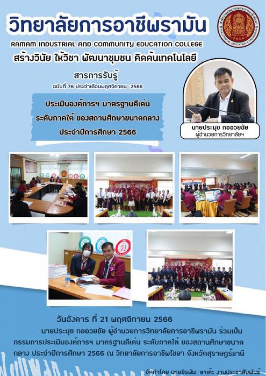 วันอังคาร ที่ 21 พฤศจิกายน 2566 นายประมุข กออวยชัย ผู้อำนวยการวิทยาลัยการอาชีพรามัน ร่วมเป็นกรรมการประเมินองค์การฯ มาตรฐานดีเด่น ระดับภาคใต้ ของสถานศึกษาขนาดกลาง ประจำปีการศึกษา 2566 ณ วิทยาลัยการอาชีพไชยา จังหวัดสุราษฎร์ธานี S:0