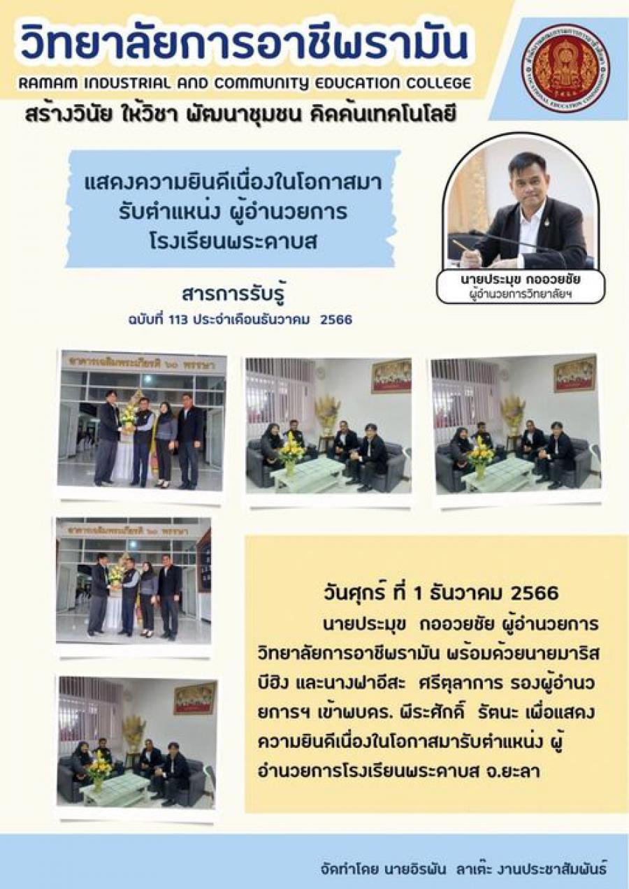วันศุกร์ ที่ 1 ธันวาคม 2566 เวลา 10.00 น. นายประมุข กออวยชัย ผู้อำนวยการวิทยาลัยการอาชีพรามัน พร้อมด้วยนายมาริส บีฮิง และนางฟาอีสะ ศรีตุลาการ รองผู้อำนวยการฯ เข้าพบดร. พีระศักดิ์ รัตนะ เพื่อแสดงความยินดีเนื่องในโอกาสมารับตำแหน่ง ผู้อำนวยการโรงเรียนพระดาบส จ.ยะลา S:0
