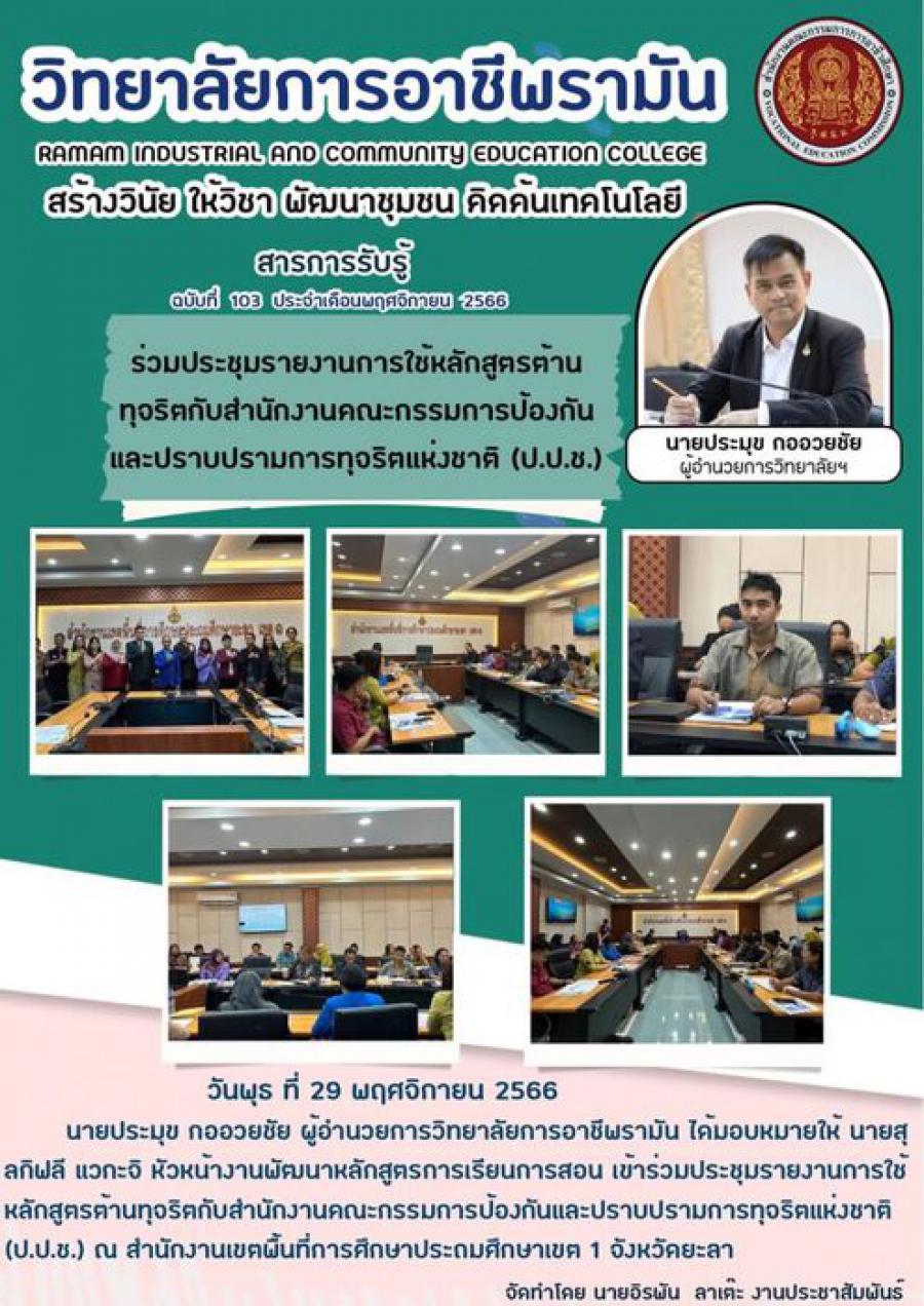 วันพุธ ที่ 29 พฤศจิกายน 2566 นายประมุข กออวยชัย ผู้อำนวยการวิทยาลัยการอาชีพรามัน ได้มอบหมายให้นายสุลกิฟลี แวกะจิ หัวหน้างานพัฒนาหลักสูตรการเรียนการสอน เข้าร่วมประชุมรายงานการใช้หลักสูตรต้านทุจริตกับสำนักงานคณะกรรมการป้องกันและปราบปรามการทุจริตแห่งชาติ (ป.ป.ช.) ณ สํานักงานเขตพื้นที่การศึกษาประถมศึกษาเขต 1 จังหวัดยะลา S:0