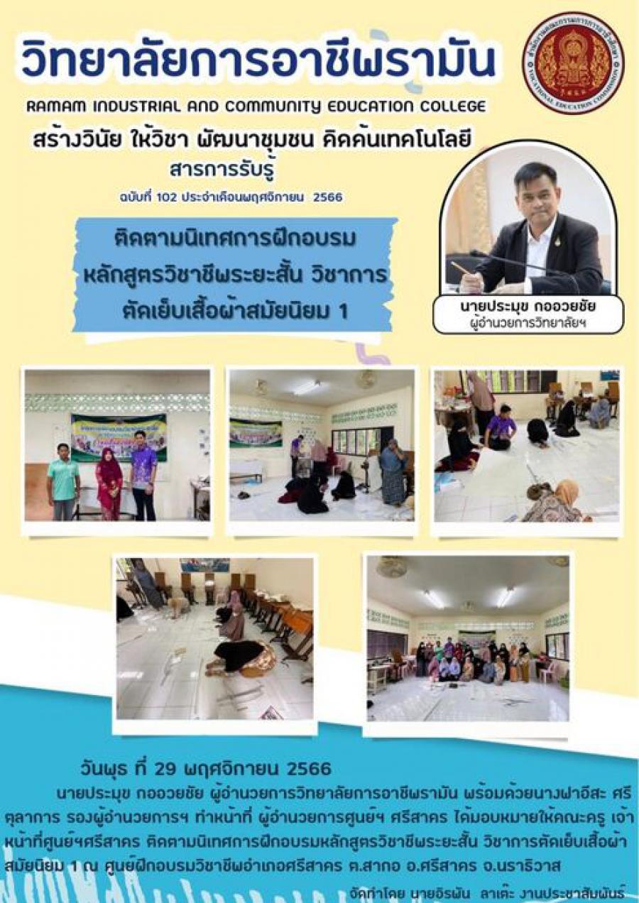 วันพุธ ที่ 29 พฤศจิกายน 2566 นายประมุข กออวยชัย ผู้อำนวยการวิทยาลัยการอาชีพรามัน พร้อมด้วยนางฟาอีสะ ศรีตุลาการ รองผู้อำนวยการฯ ทำหน้าที่ ผู้อำนวยการศูนย์ฯ ศรีสาคร ได้มอบหมายให้คณะครู เจ้าหน้าที่ศูนย์ฯศรีสาคร ติดตามนิเทศการฝึกอบรมหลักสูตรวิชาชีพระยะสั้น วิชาการตัดเย็บเสื้อผ้าสมัยนิยม 1 ณ ศูนย์ฝึกอบรมวิชาชีพอำเภอศรีสาคร ต.สากอ อ.ศรีสาคร จ.นราธิวาส S:0