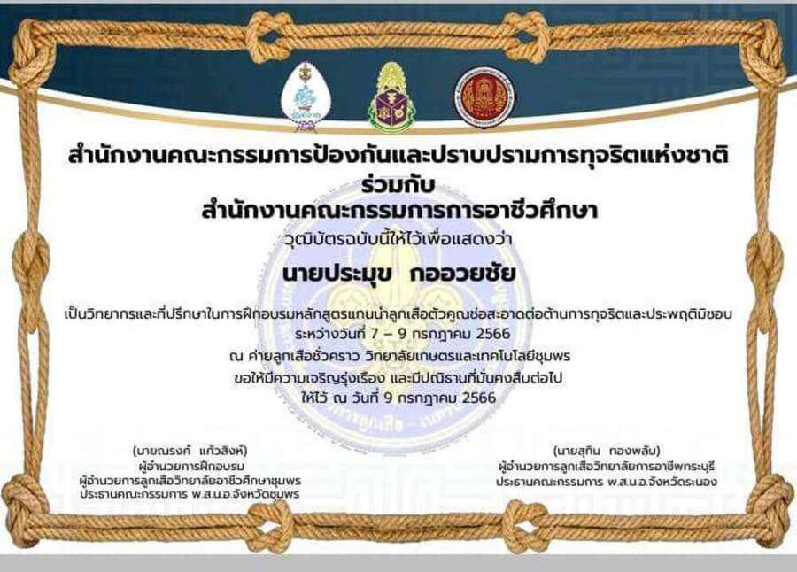 นายประมุข กออวยชัย ร่วมพัฒนา กิจการลูกเสือช่อสะอาด ให้กับ พ.ส.น.อ.ชุมพร และ พ.ส.น.อ.ระนอง ตามบทบาทที่ได้รับมอบหมาย ทั้ง เป็นที่ปรึกษาโครงการฯ วิทยากร บรรยาย/สันทนาการ ณ วิทยาลัยเกษตรและเทคโนโลยีชุมพร ระหว่าง 7-9 กค. 2566 S:0