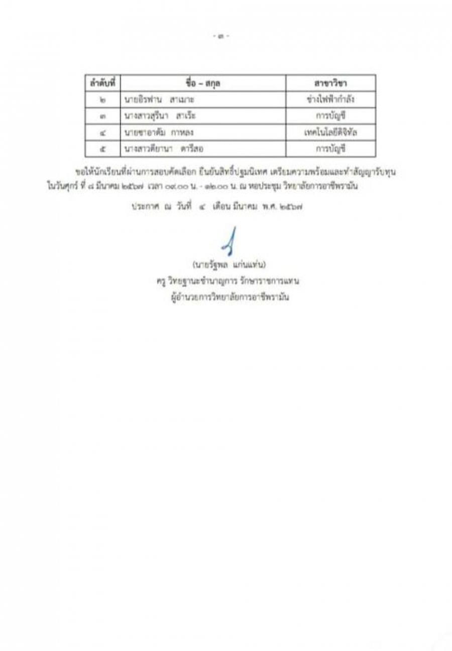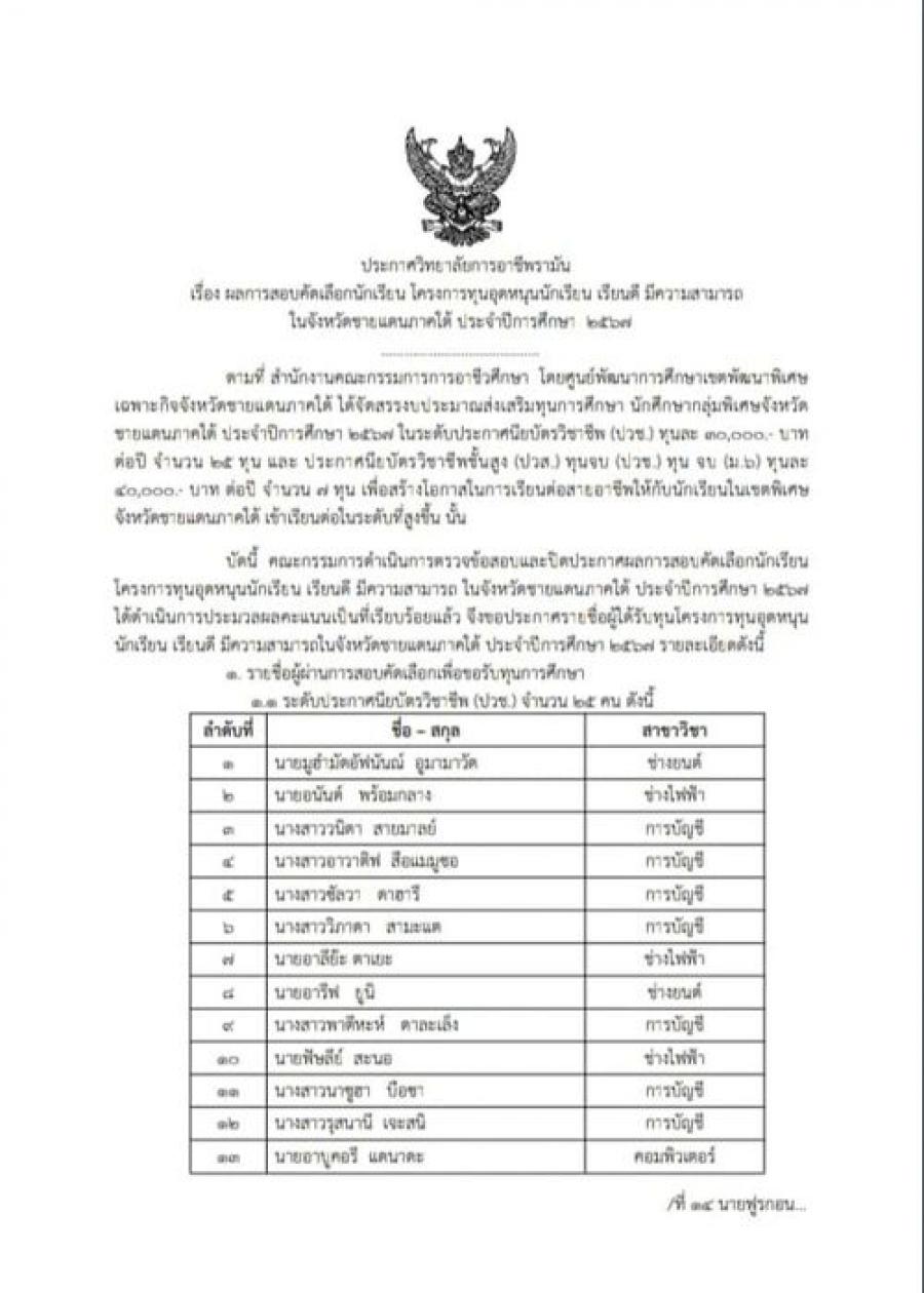 ประกาศผลการสอบคัดเลือกโครงการทุนอุดหนุนนักเรียน เรียนดี มีความสามารถ ในจังหวัดชายแดนภาคใต้ ประจําปีการศึกษา 2567???? - ระดับประกาศนียบัตรวิชาชีพ (ปวช.) จำนวน 25 ทุน - ระดับประกาศนียบัตรวิชาชีพชั้นสูง(ปวส.)จำนวน7 ทุน ????????นักเรียน นักศึกษาที่มีรายชื่อผ่านการสอบคัดเลือก ยืนยันสิทธิ์และทำสัญญารับทุน ???? ในวันศุกร์ที่ 8 มีนาคม 2567 เวลา 09:00-12.00 น. ณ หอประชุมวิทยาลัยการอาชีพรามัน #หมายเหตุ ให้นักเรียน นักศึกษา พร้อมผู้ปกครองมาในวันดังกล่าว S:0