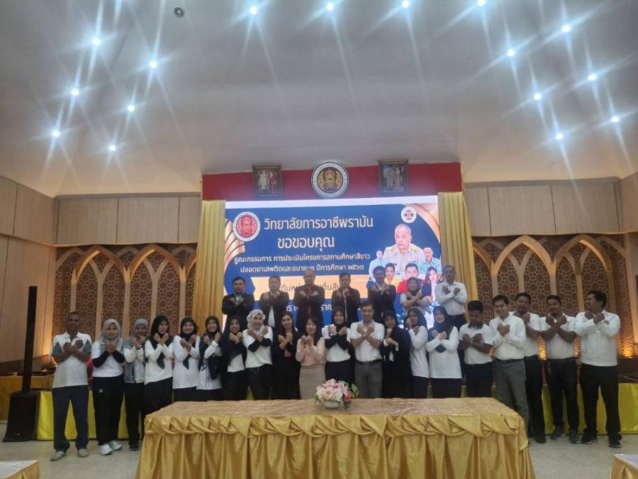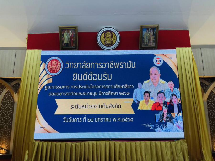 นอังคาร ที่ 28 มกราคม 2568 นายประมุข กออวยชัย ผู้อำนวยการวิทยาลัยการอาชีพรามัน พร้อมด้วยนายมาริส บีฮิง นางฟาอีสะ ศรีตุลาการ รองผู้อำนวยการฯ คณะครู บุคลากรทางการศึกษา และนักเรียนนักศึกษา ร่วมต้อนรับคณะกรรมการเพื่อรับการประเมินโครงการสถานศึกษาสีขาวปลอดยาเสพติดและอบายมุข ปีการศึกษา 2567 ระดับหน่วยงานต้นสังกัด โดยมีนายอิทธิฤทธิ์ ศรีชุมภู ผู้อำนวยการวิทยาลัยเทคนิคยะลา ปฏิบัติหน้าที่ผู้อำนวยการผู้อำนวยการสำนักงานอาชีวศึกษาจังหวัดยะลา เป็นประธานในการประเมินฯ ณ วิทยาลัยการอาชีพรามัน S:0