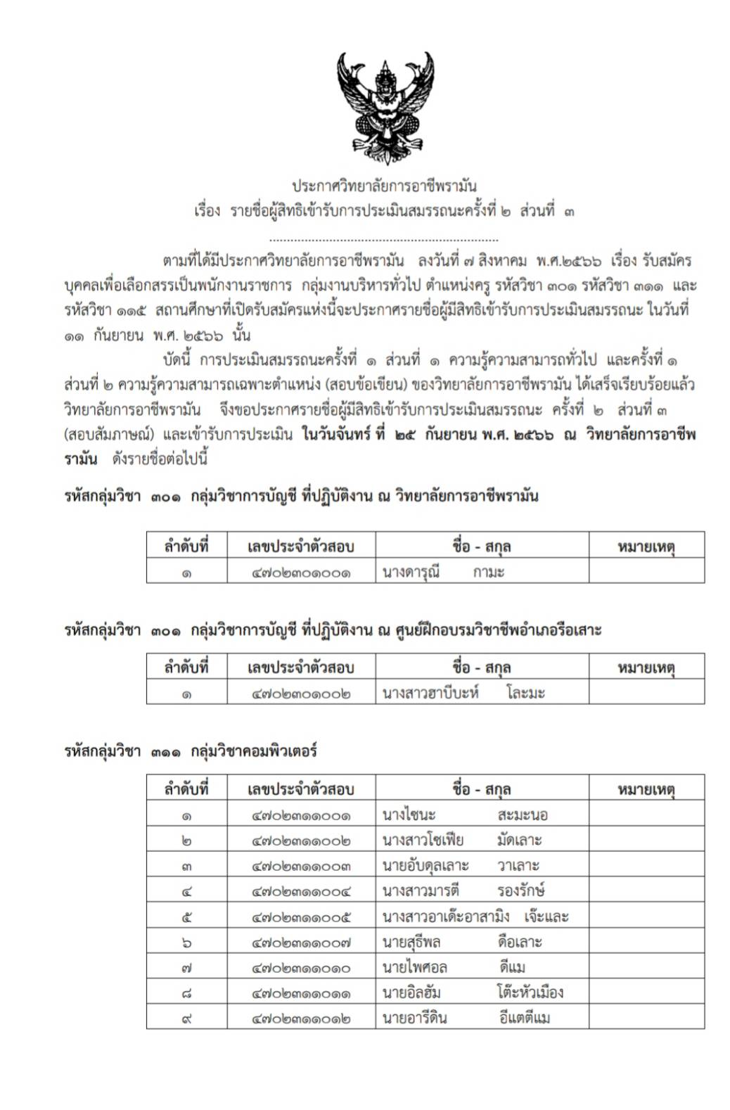 ประกาศรายชื่อผู้มีสิทธิ์เข้ารับการประเมินสมรรถนะครั้งที่ 2 ส่วนที่ 3