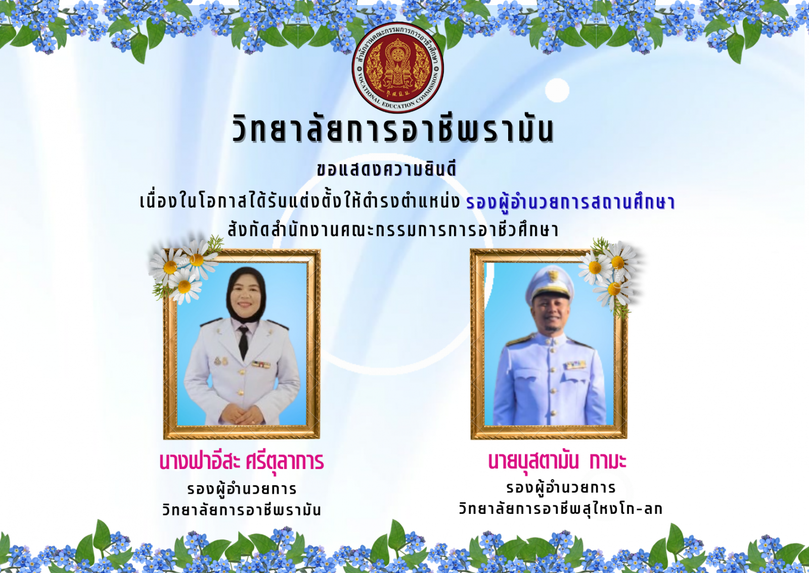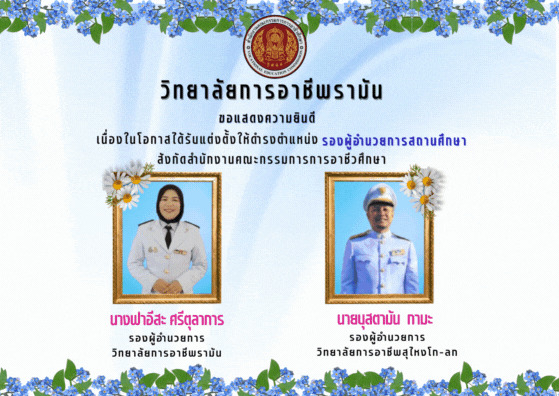 ขอแสดงความยินดีกับบุคลากรทั้ง 2 ท่าน เนื่องในโอกาสได้รับแต่งตั้งให้ดำรงตำแหน่ง รองผู้อำนวยการสถานศึกษา สังกัดสำนักงานคณะกรรมการการอาชีวศึกษา