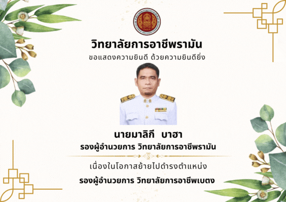 ขอแสดงความยินดีด้วยความยินดียิ่ง เนื่องจากย้ายไปดำรงตำแหน่งรองผู้อำนวยการ วิทยาลัยการอาชีพเบตง